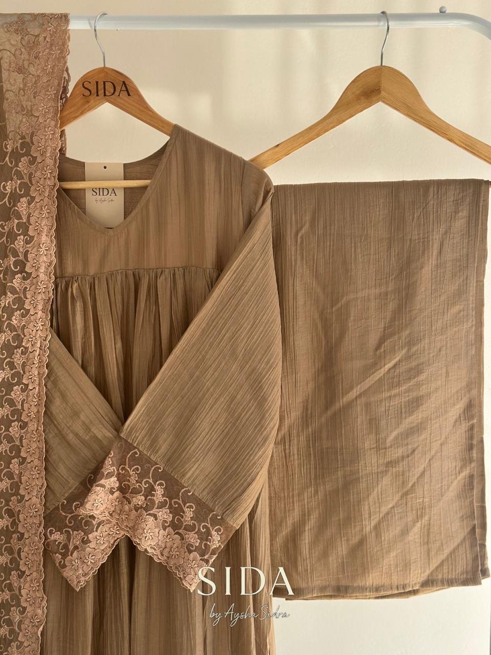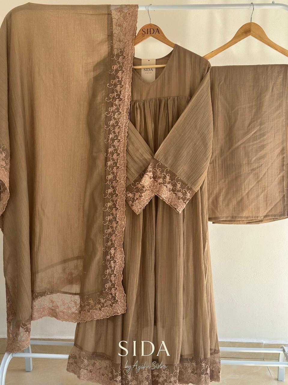 Stunning Latte beige Imported material Anarkali set with lace detailing. Paired with palazzo and lace detailed dupatta.
