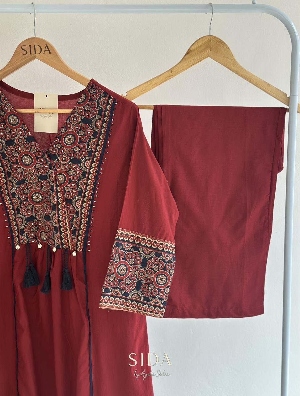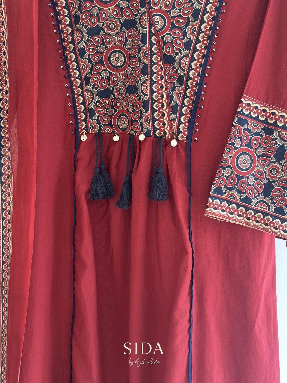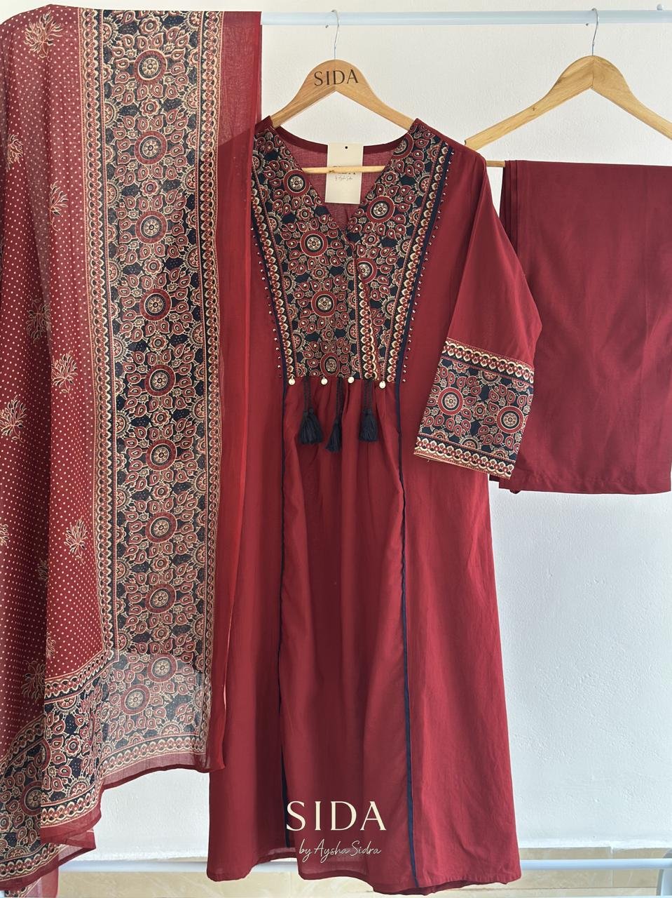 Beautiful Maroon cotton 3 pcs Aline set with side slit with tassels and sequins work. Paired with plain palazzo bottom and printed dupatta.